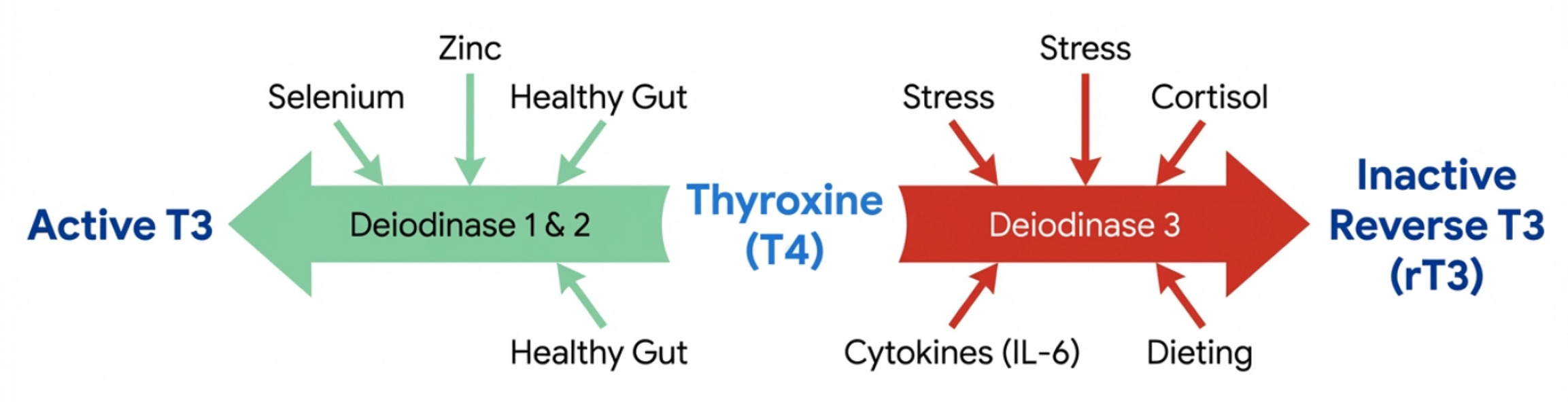 Thyroxine, T4, is a storage hormone. It does nothing until it is converted. The enzyme iodothyronine deiodinase cleaves one iodine atom from T4 to produce triiodothyronine, T3, the active signaling molecule that enters the cell nucleus, binds to thyroid hormone receptors, and initiates the transcription of genes governing metabolism, cognition, mood, and cardiovascular function. When conventional medicine prescribes levothyroxine monotherapy, it assumes that this conversion pathway is universally intact.