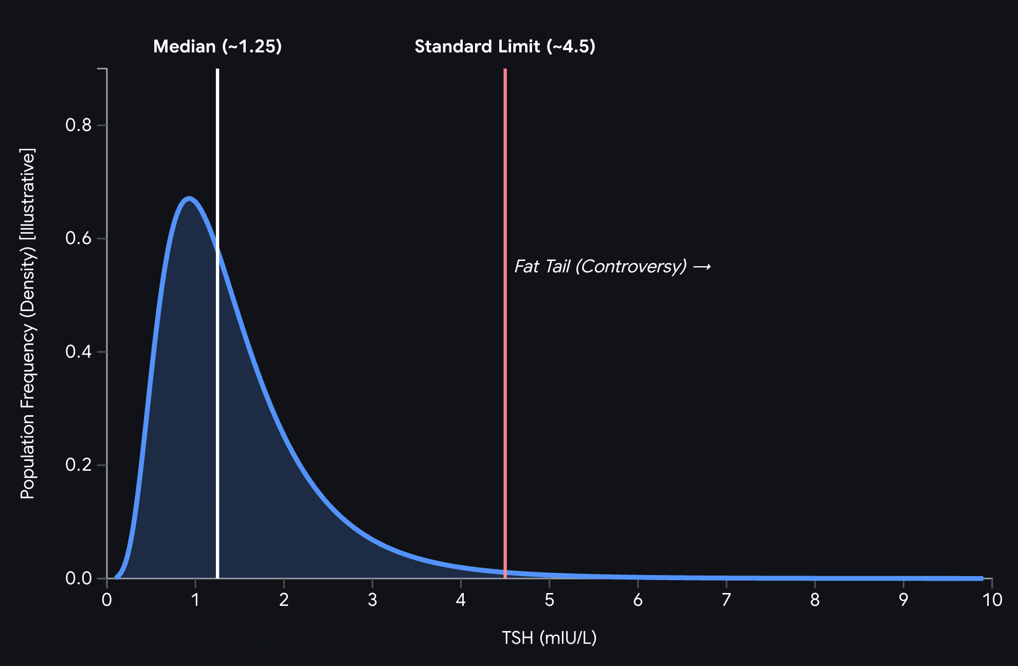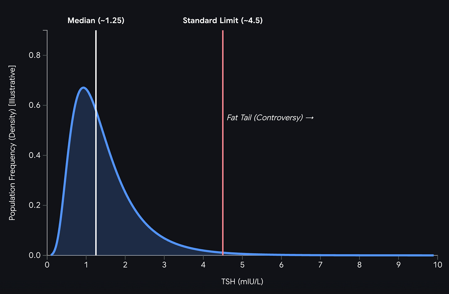 It gets worse. Even within that “disease-free” reference population, the TSH distribution was not Gaussian. It was right-skewed, with a long upper tail. The reason is that antibody-negative Hashimoto’s thyroiditis is real. Thyroid ultrasound can reveal structural changes due to lymphocytic infiltration before antibodies are ever detectable in the blood. The reference population was contaminated from the start by the very disease it was supposed to exclude.