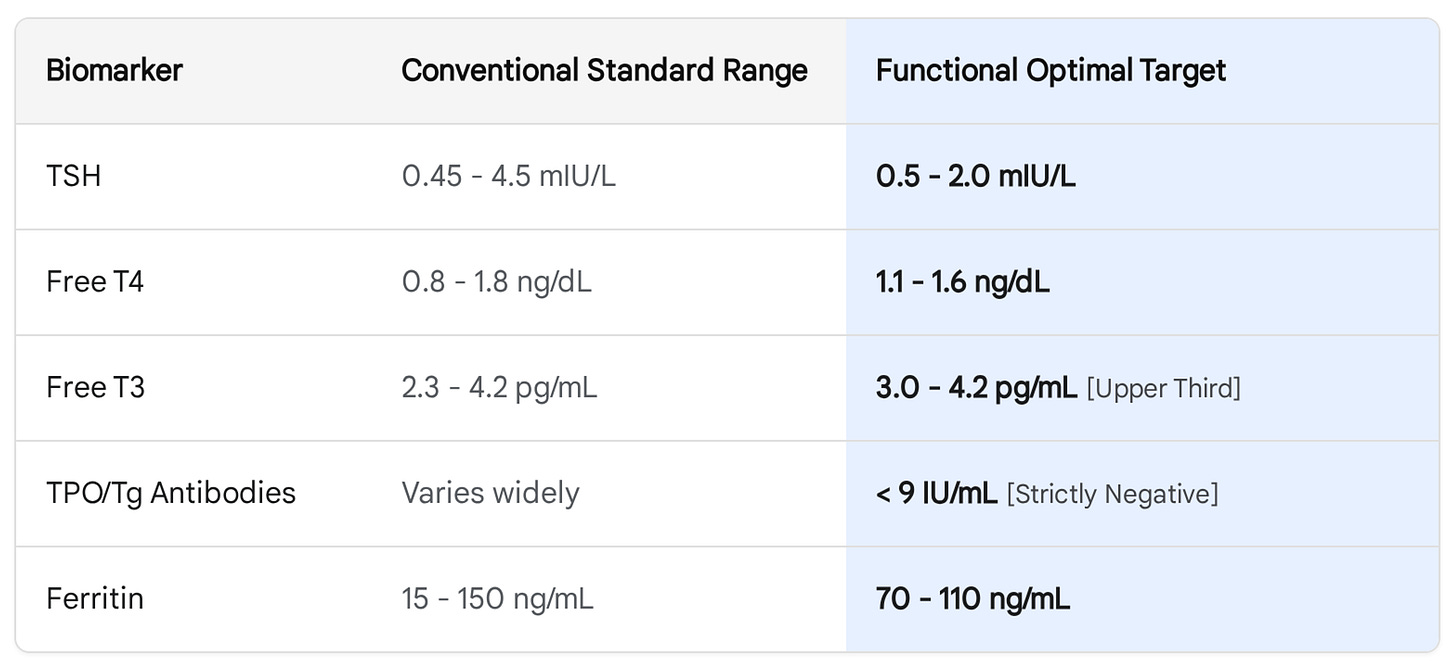 In symptomatic patients, the functional target for TSH is 1.0 to 2.0 mIU/L, not “anywhere under 4.5.” Free T3 should sit in the upper third of the reference range. A normal TSH with a low-normal free T3 is not a clean bill of health. It is a conversion problem.